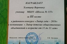 Поздравляем Хлопцеву Веронику, занявшую 3 место в районном конкурсе "Лидер года - 2016" в номинации "Лидер детских общественных объединений в возрасте от 11 до 13 лет"
