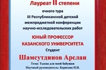 Поздравляем Шамсутдинова Арслана, ученика 3-Б класса, с победой на очном туре III Республиканской детской межпредметной конференции научно-исследовательских работ "Юный профессор Казанского университета" (Диплом лауреата IIстепени). Научный руководитель - Борисова Нина Николаевна