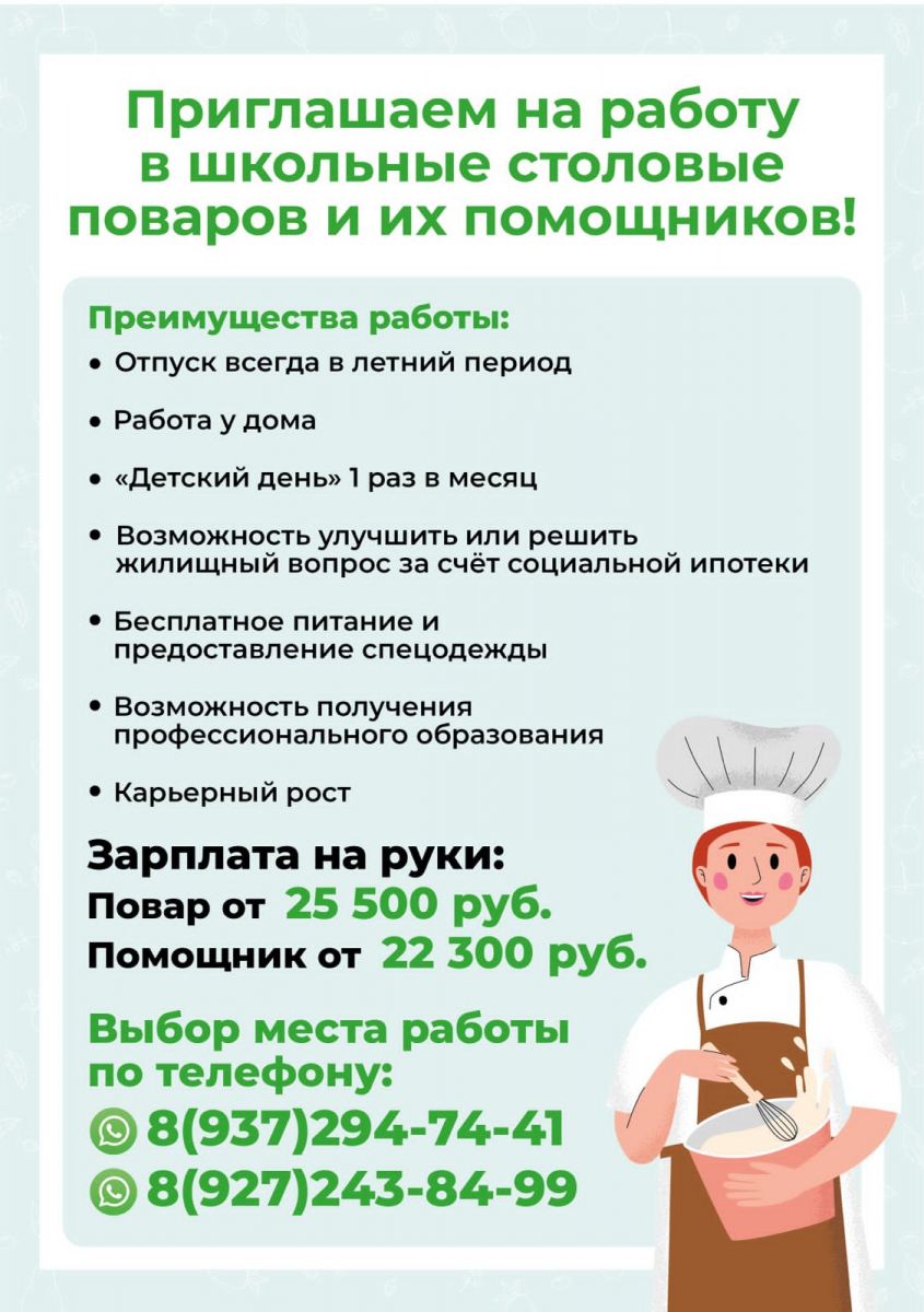 Приглашаем на работу в школьные столовые поваров и их помощников 21.08.2023
