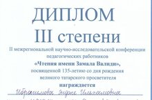 Поздравляем учителя родного (татарского) языка и литературы Ибрагимову Эндже Ильхамовну с III местом во II межрегиональной научно-исследовательской конференции педагогических работников "Чтения имени Замала Валиди"!