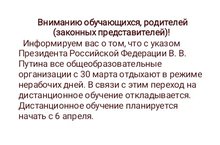 Просим ВАС с пониманием отнестись к переходу на дистанционное обучение, это делается ради ВАС и ВАШИХ детей.