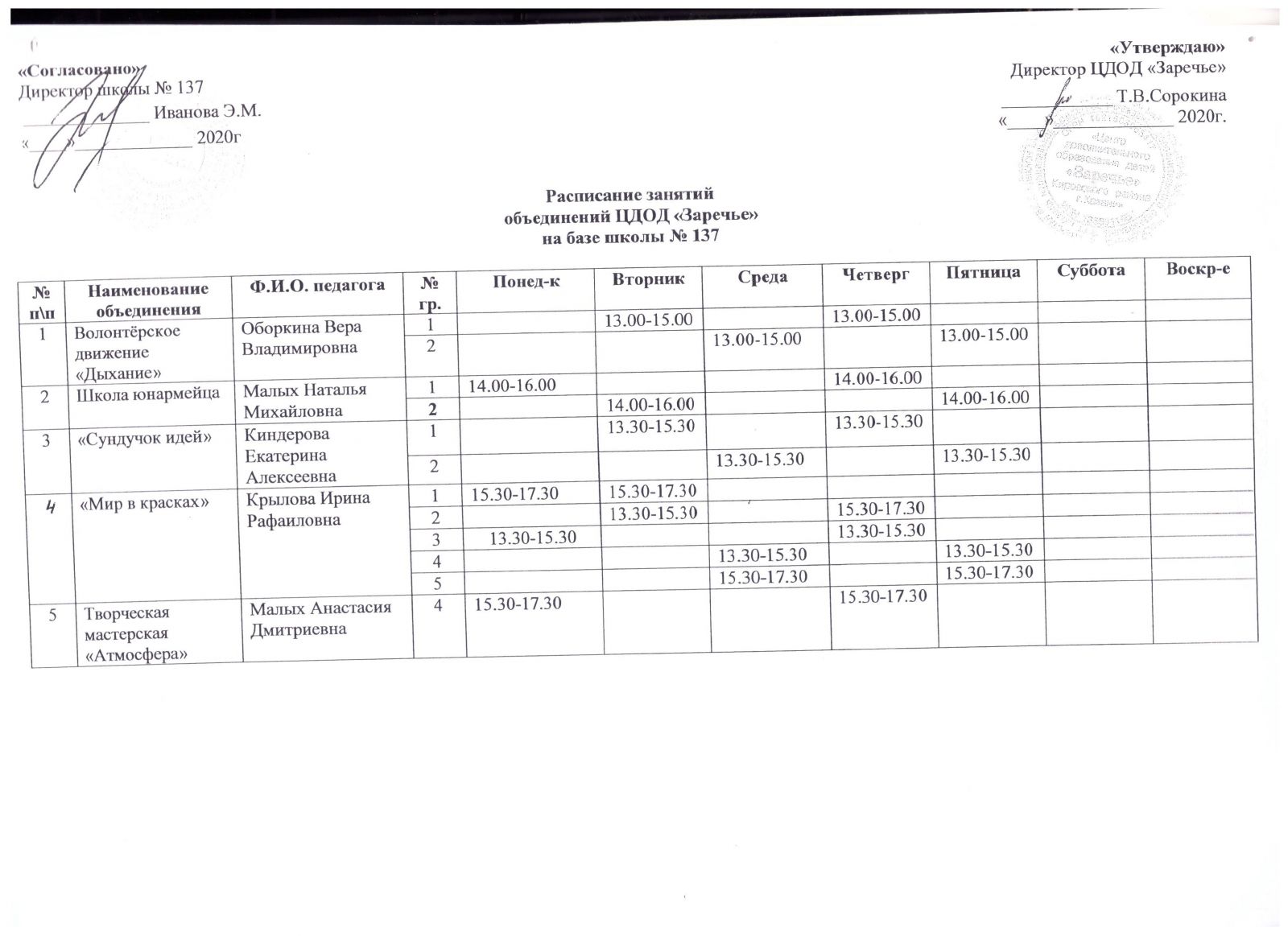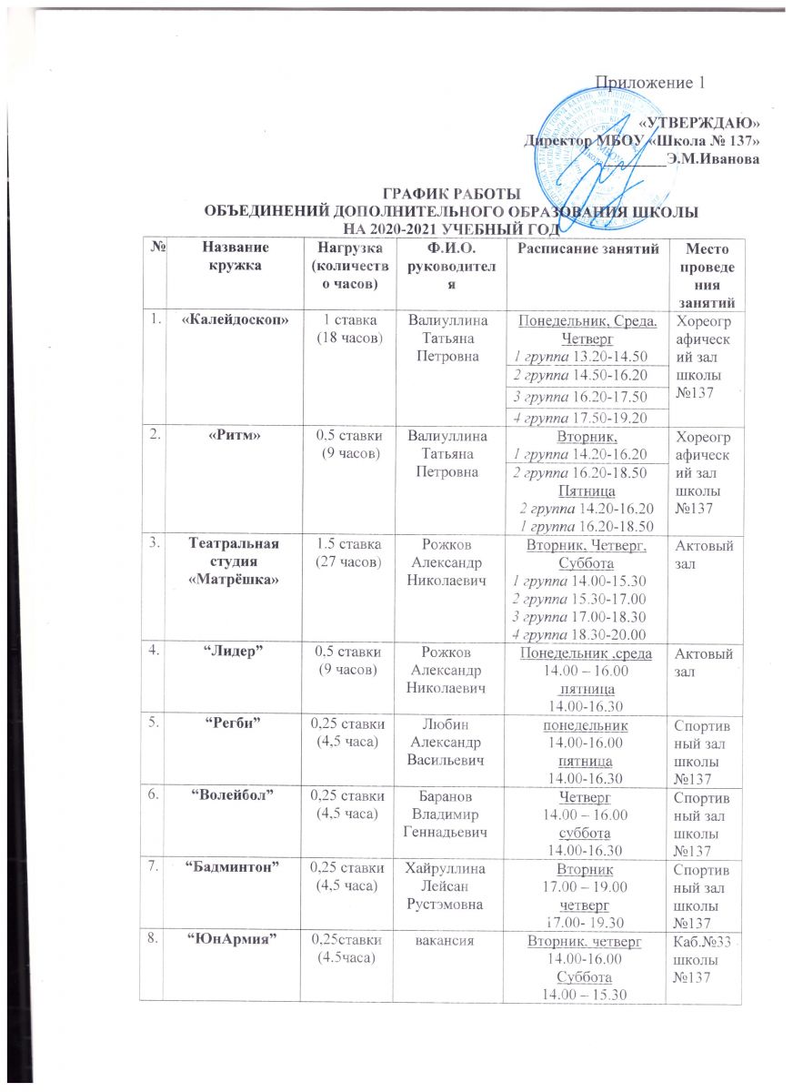 График работы объединений дополнительного образования школы на 2020-2021 учебный год