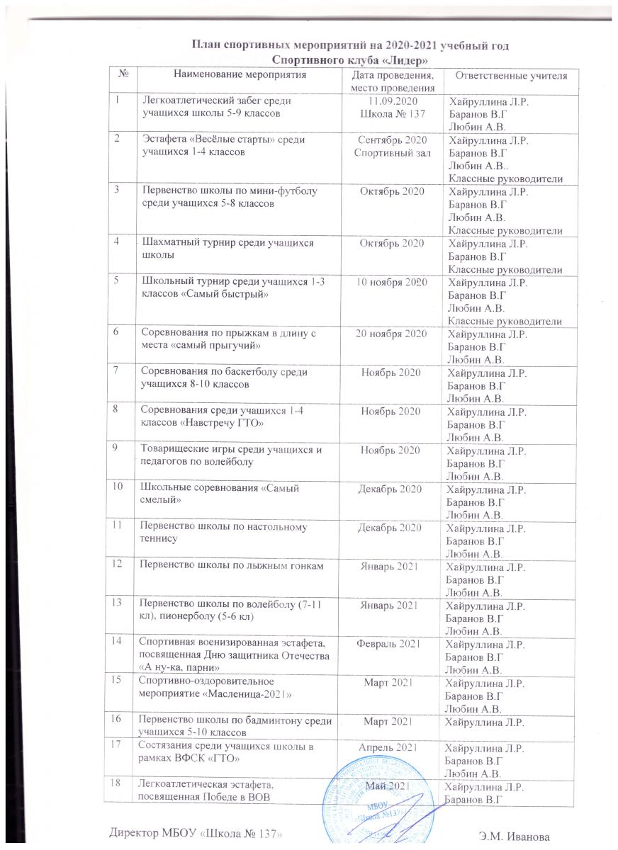 Календарный план спортивных мероприятий клуба "Лидер" на 2020-2021 учебный год