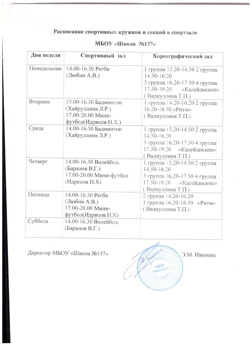 Расписание спортивных кружков и секций в сортзале МБОУ "Школа №137"
