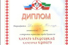 Дипломом наградили Шигапова Тимура (ученик 5 класса), который занял 3 место в открытом первенсте города Казани по каратэ кёкусинкай категория кумитэ.