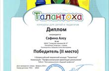 Дипломом наградили Сафину Алсу, победителя (II место) V Всероссийского творческого конкурса "Талантоха" в номинации "Профессиональная ориентация школьников". Работа "Мои размышления о будущей профессии".