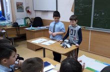Учащиеся Хариосв Ильназ и Ермаков Руслан показали и рассказали учащимся про робота. Педагог Ниурзиянов Э.Т