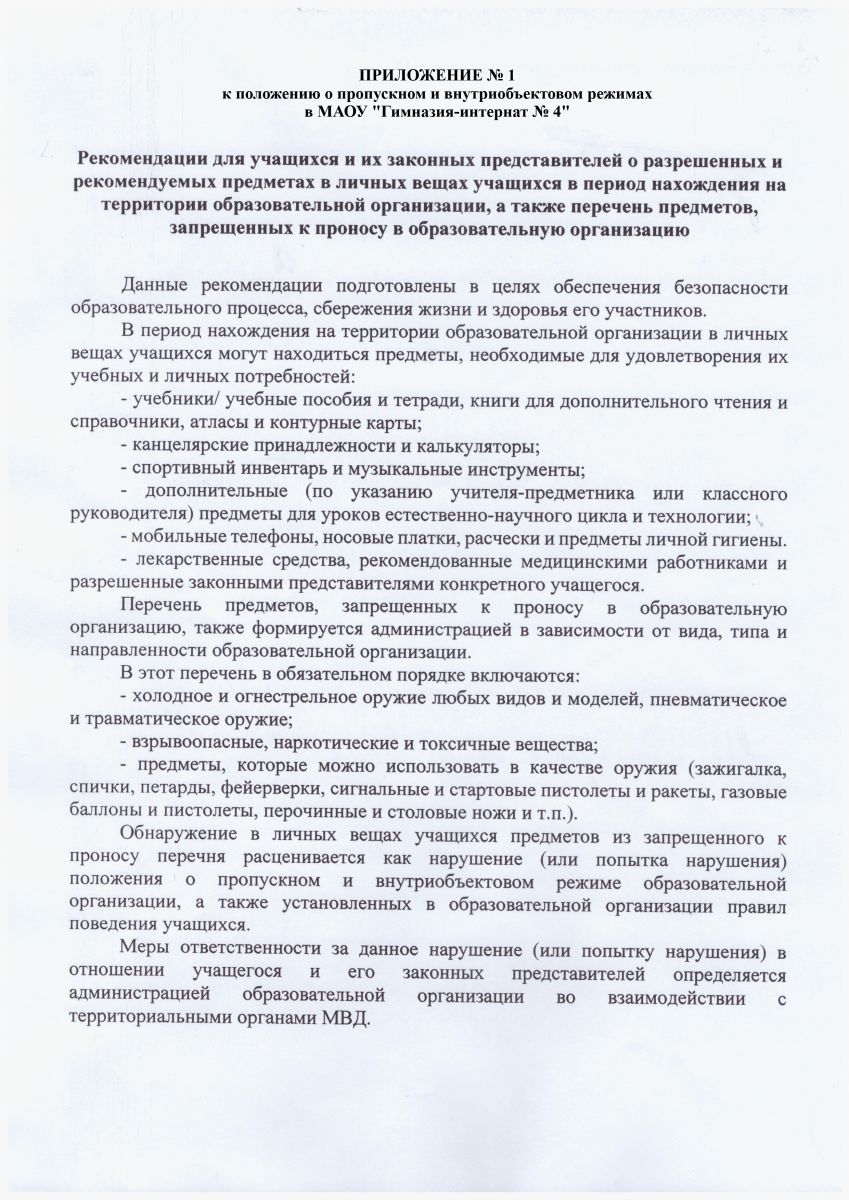 Положение о пропускном и внутриобъектовом режимах МАОУ Гимназия-интернат №4