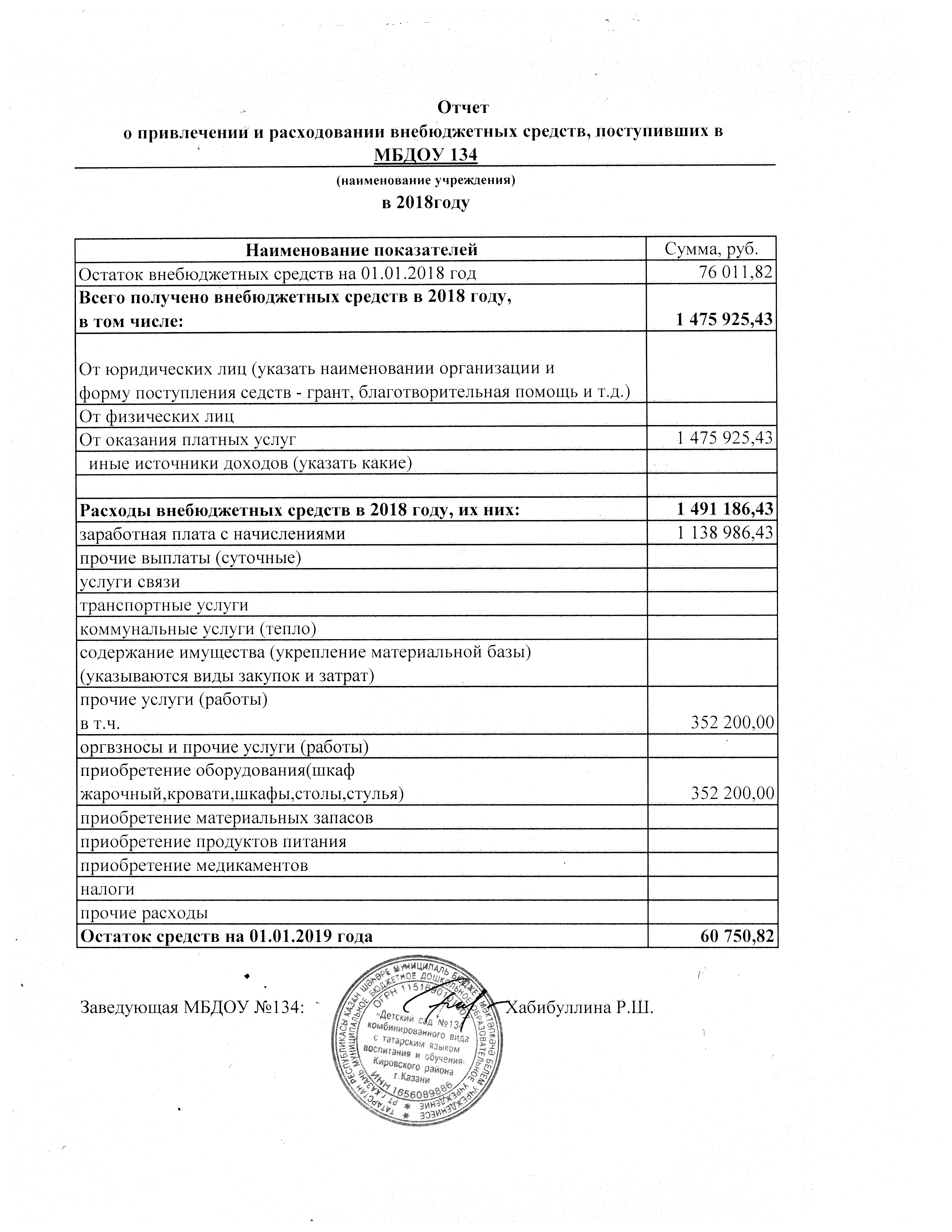 Отчет о привлечении и расходовании внебюджетных средств поступивших в МБДОУ № 134 в 2018 г.
