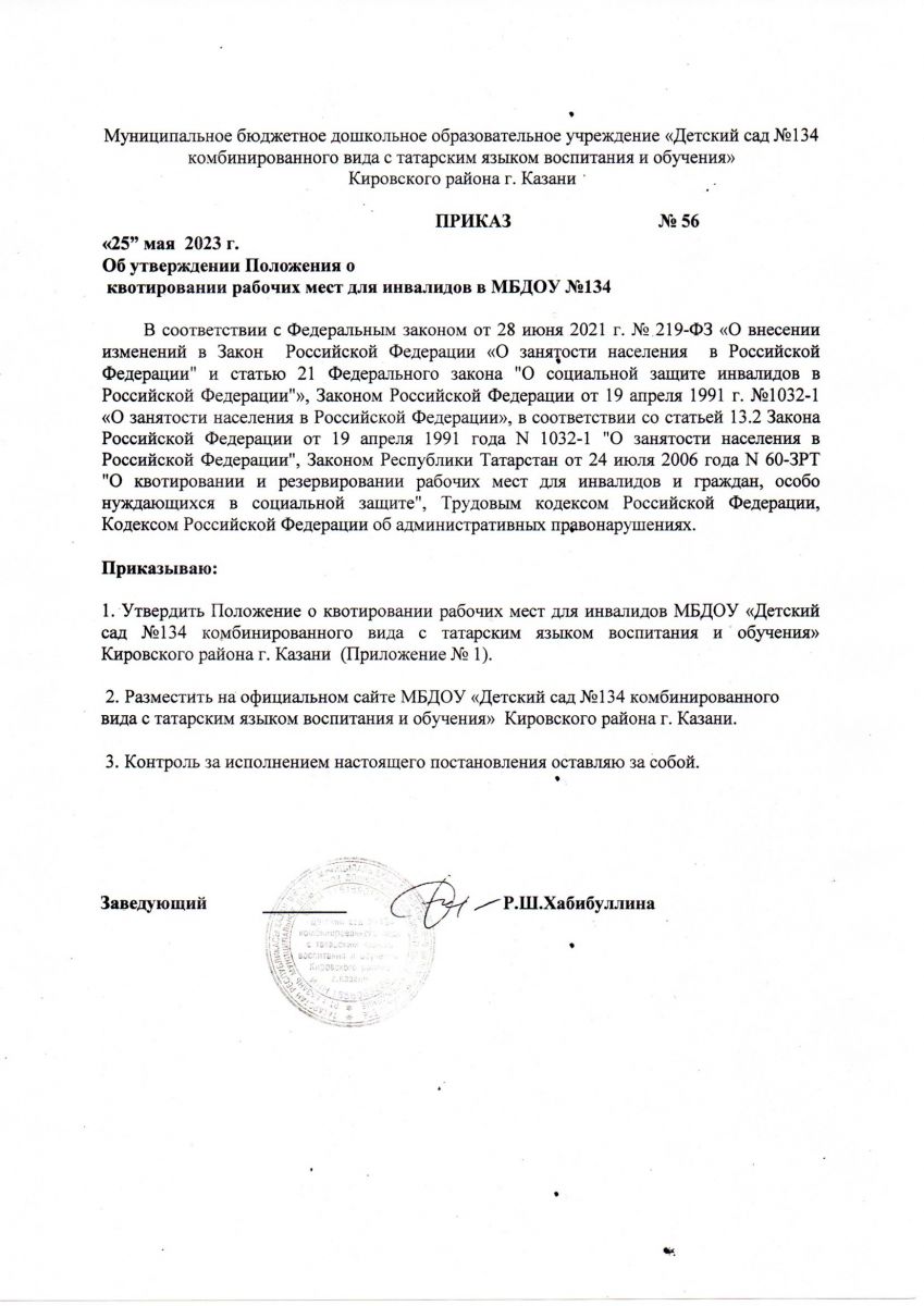 Приказ об утверждении Положения о квотировании рабочих мест для инвалидов в МБДОУ 134