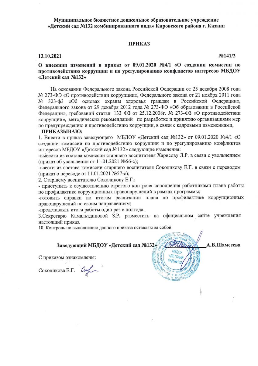 Приказ о внесении зменений в состав комиссии по антикоррупции 2021