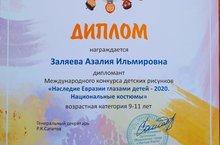 Поздравляем воспитанницу изостудии " Оранжевое небо" Заляеву Азалию ( педагог Заляева Р. Р.)!! Юная художница вошла в число дипломатов Международного конкурса детских рисунков "Наследие Евразии глазами детей - 2020. Национальные костюмы"! Сертифткаты участников конкурса получили также Самитова Алия, Минневалиева Алиса и Ситнова Ксения! Знай наших!!