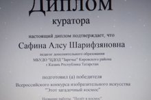 Поздравляем Мурзину Лиану, уч-ся объединения "Ромашка " и педагога Сафину А. Ш. с победой во Всероссийском конкурсе изобразительного искусства " Этот загадочный космос".