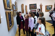 Юные художники изо студии " Оранжевое небо" побывали сегодня в выставочном зале " Манеж" и познакомились с творчеством Асхана Фатхутдинова. Татарский художник и скульптор, его творчество очень многогранно и интересно. Художник часто обращается к теме татарской культуры и быта. Сочетание скульптуры из дерева, живописи маслом и свой, философский взгляд на мир- вот что в первую очередь отличает работы этого Творца.