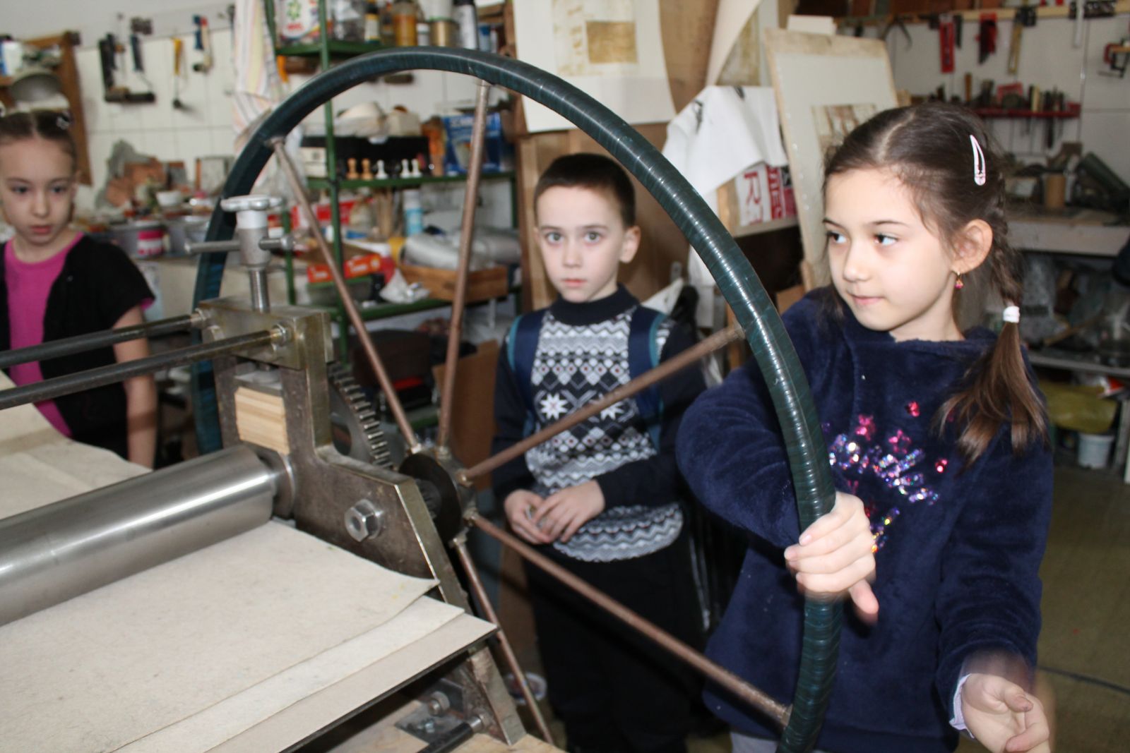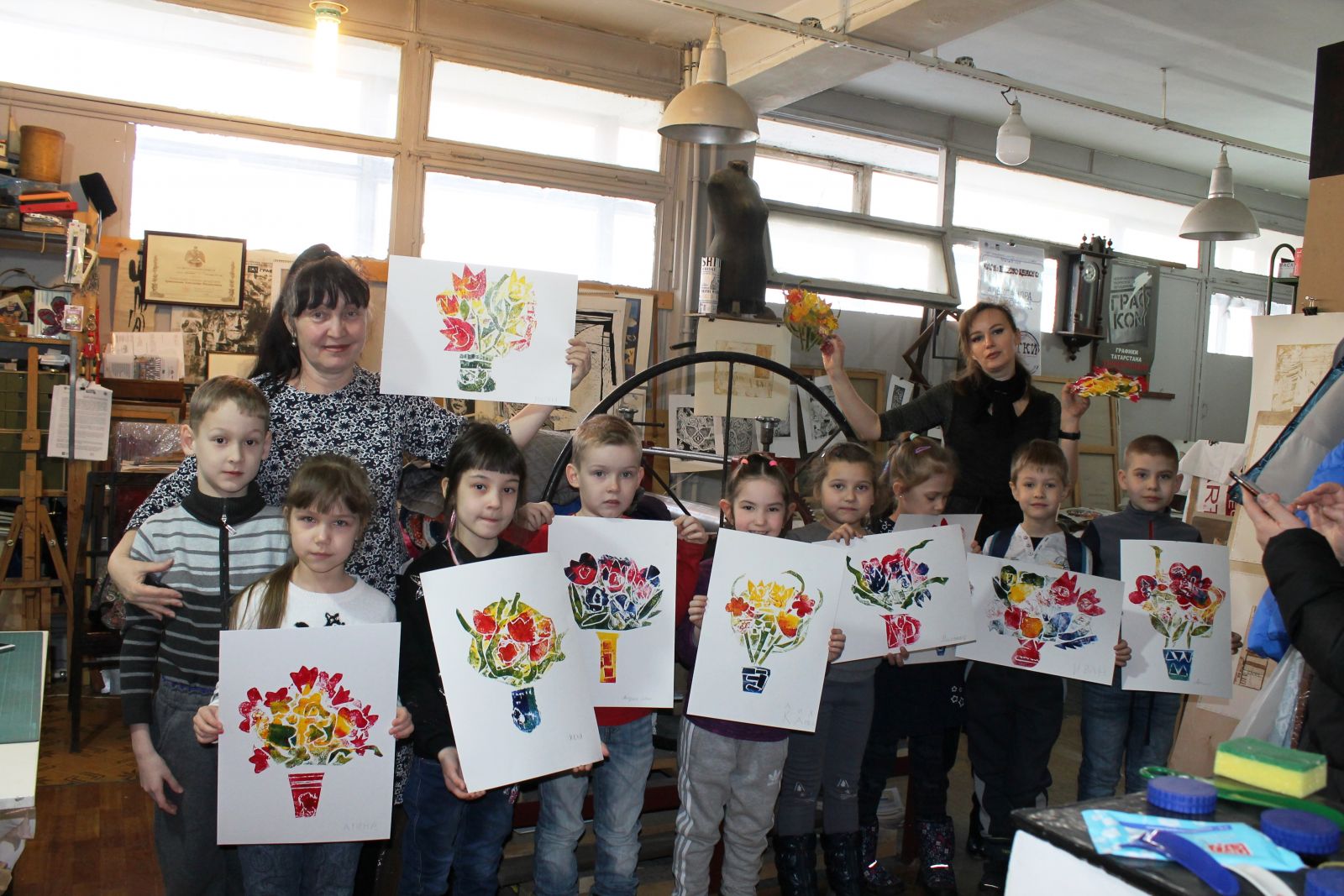 В прекрасный весенний день ребята из объединения ИЗО «Ступени» гр.№5 (педагог Забирова Т. А.) посетили мастерскую заслуженного художника Татарстана Александра Артамонова. Здесь молодой педагог Карасёва В. В. провела для наших ребят мастер-класс по печатной графике на тему «Букет для мамы!». Изготовление оттиска, запах настоящей типографской краски, печатный станок – всё это настолько интересно, познавательно и увлекательно, а самое важное это готовый подарок, сотворенный своими руками, для любимой мамы к 8 марта!
