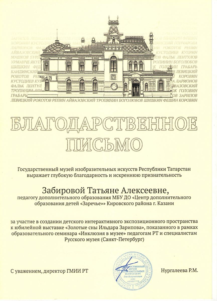25 января 2020 года ребята из объединения ИЗО «Ступени» (педагог Забирова Т. А.) гр.2 и гр.4 посетили юбилейную выставку «Золотые сны Ильдара Зарипова». Учащаяся Центра «Заречье» стали не только посетителями музейного пространства, но и его участниками. Их яркие, оригинальные работы украсили детское интерактивное экспозиционное пространство посвященное творчеству замечательного татарского художника И. Зарипова.