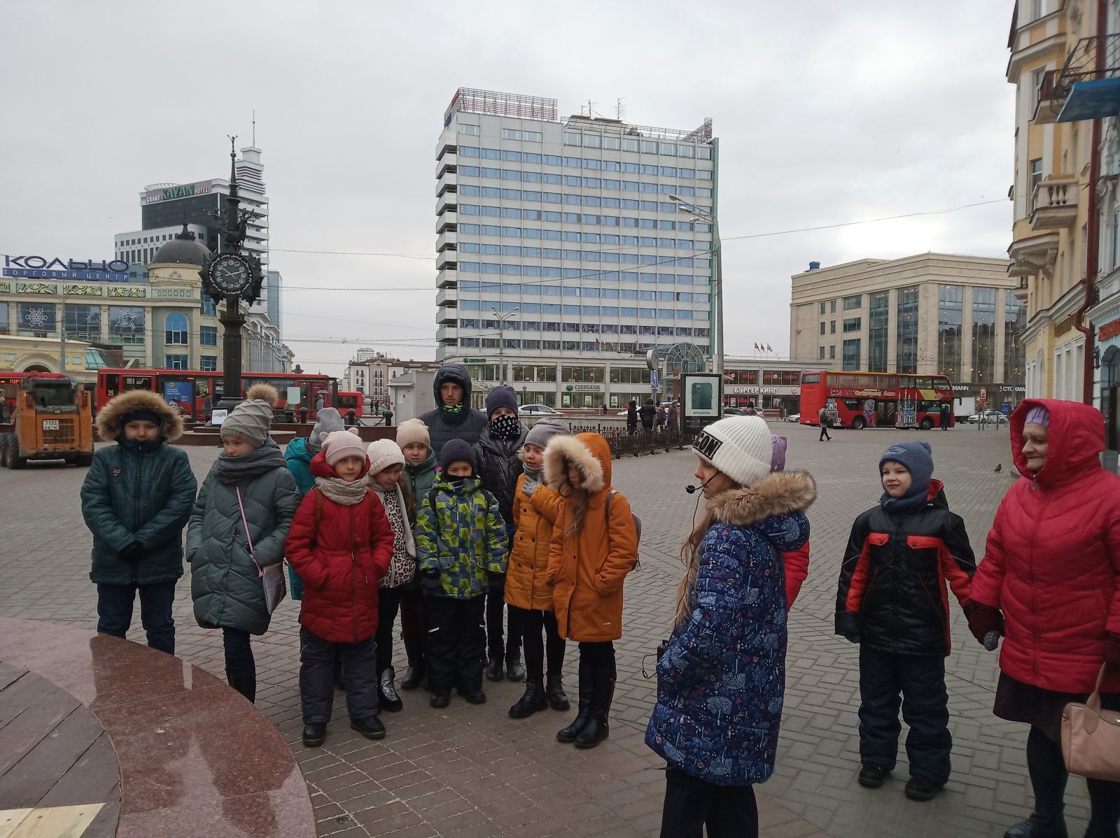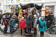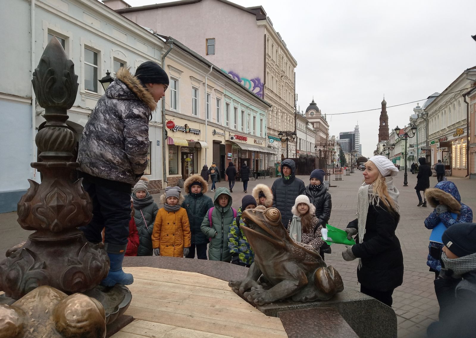 1 ноября 2019 года ребята из объединения ИЗО «Ступени» (педагог Забирова Т. А.) гр. №2 и №3, посетили сегодня самую красивую улицу нашего города – ул. Э. Баумана. Экскурсию нам проводили ребята из объединения «Юный экскурсовод» (педагог Анисимова Т. Л.) Главная улица в Казани похожа на музей: фигурные часы, фонтаны, Екатерининская карета, скульптура «Кот Казанский». Для скульптуры важно её окружение. Ей необходимо, чтобы вокруг был воздух, менялись свет и погода. Погода была морозной, мы съёжились от холода, но всё же получили яркие не забываемые впечатления. А скульптурки на улице Э. Баумана стояли будто немного скованно – наверное, они тоже немного замёрзли! Фонтан Жабы ; Встреча у часов