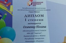 Сегодня, в день защиты детей состоялось открытие Республиканской выставки - конкурса детского рисунка "Вглядываясь в мир". Организатор выставки- Казанское Художественное Училище имени Фешина- отобрали для мероприятия самые лучшие и интересные работы талантливых ребят - учащихся Детских Художественных Школ со всей Республики. Очень приятно, что работа нашей воспитанницы Самитовой Алии (изостудии "Оранжевое небо", педагог Заляева Резеда Рашидова) тоже смогла принять участие в выставке! Из разговора с директором КХУ им. Фешина- Гильмутдиновой Ольгой Александровной- Алия узнала, что осваивать профессию художника и дизайнера очень тяжело, но решила непременно поступать именно в это учебное заведение!