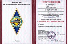 Директор нашего Центра - Сорокина Татьяна Викторовна, решением Оргкомитета Международного Форума "Инновации и развитие" награждена Почётным знаком "Отличник Образования России". Поздравляем, Вас, Татьяна Викторовна и желаем дальнейших успехов!