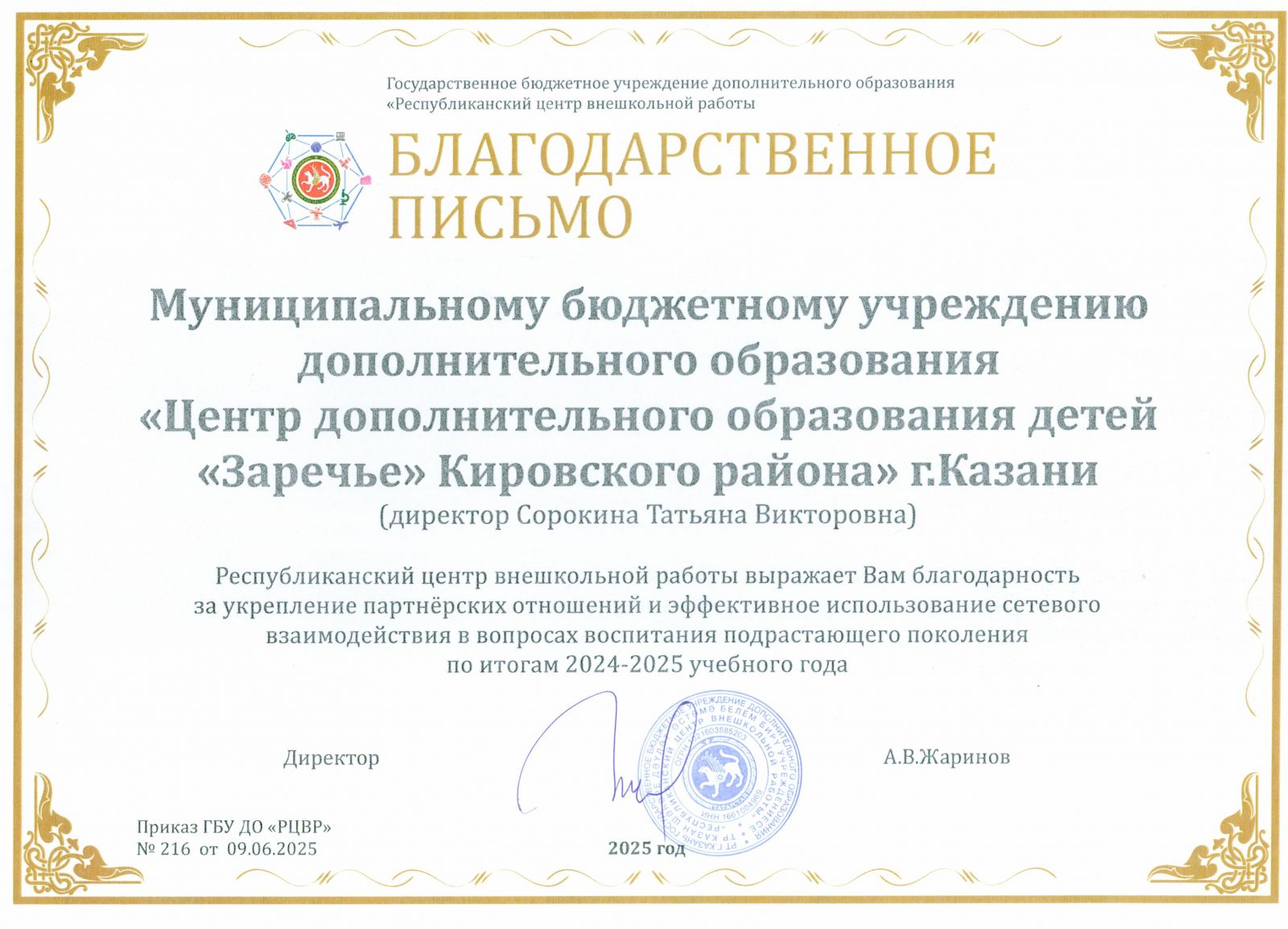 24 сентября 2025 года состоялось совещание директоров учреждений дополнительного образования Республики Татарстан, на котором нашему Центру вручено Благодарственное письмо за укрепление партнёрских отношений и эффективное использование сетевого взаимодействия в вопросах воспитания подрастающего поколения по итогам 2024-2025 учебного года
