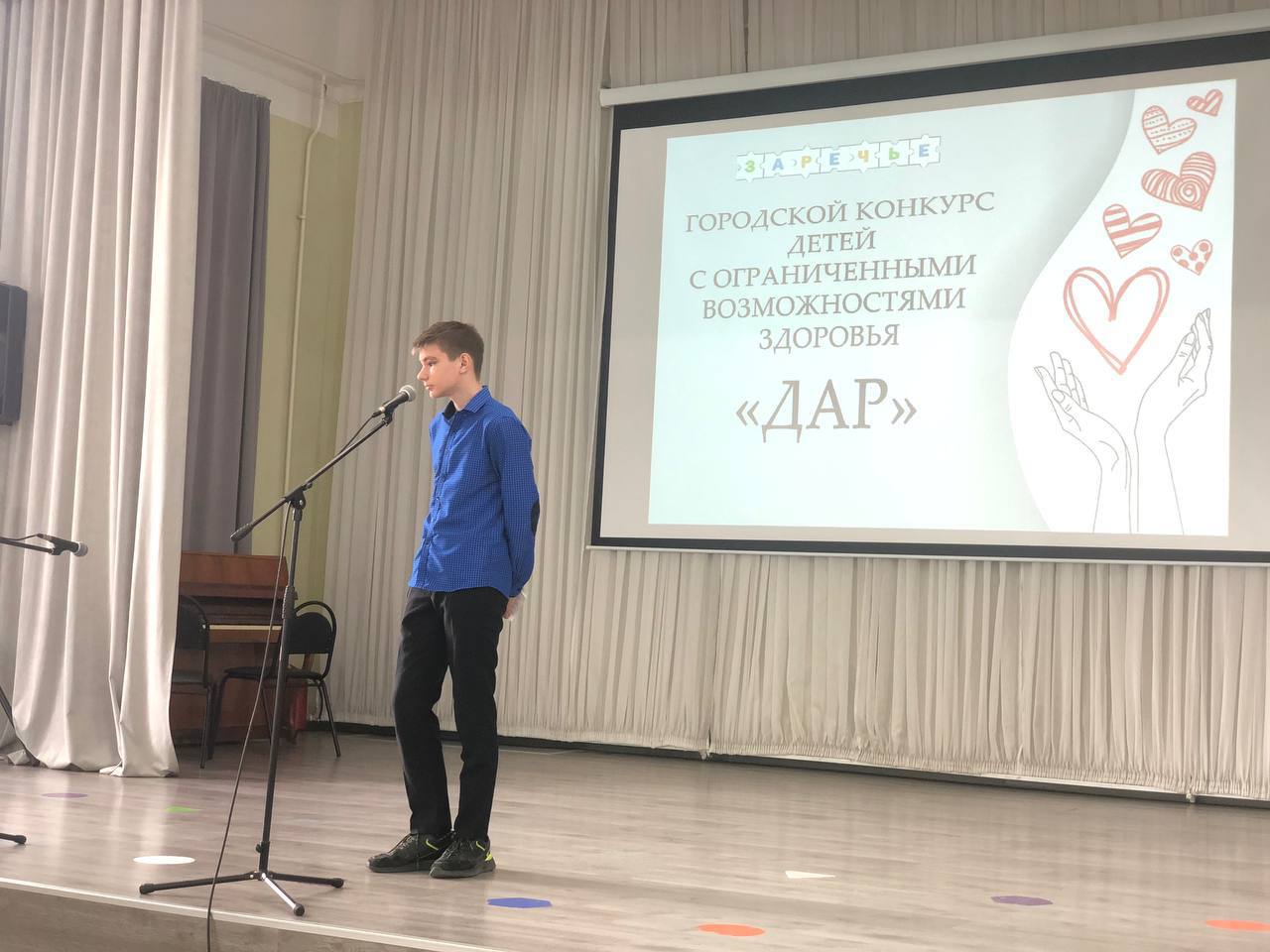 Опубликовано: 26.04.2022Сегодня прошёл ежегодный Городской конкурс художественного творчества для детей с ОВЗ «Дар». Участники конкурса проявляли свои таланты в различных номинациях: «Художественное слово», «Вокал», «Танец», «Прикладное творчество». Победители отборочного тура получат свои заслуженные награды и примут участие 12-го мая в Гала-концерте.