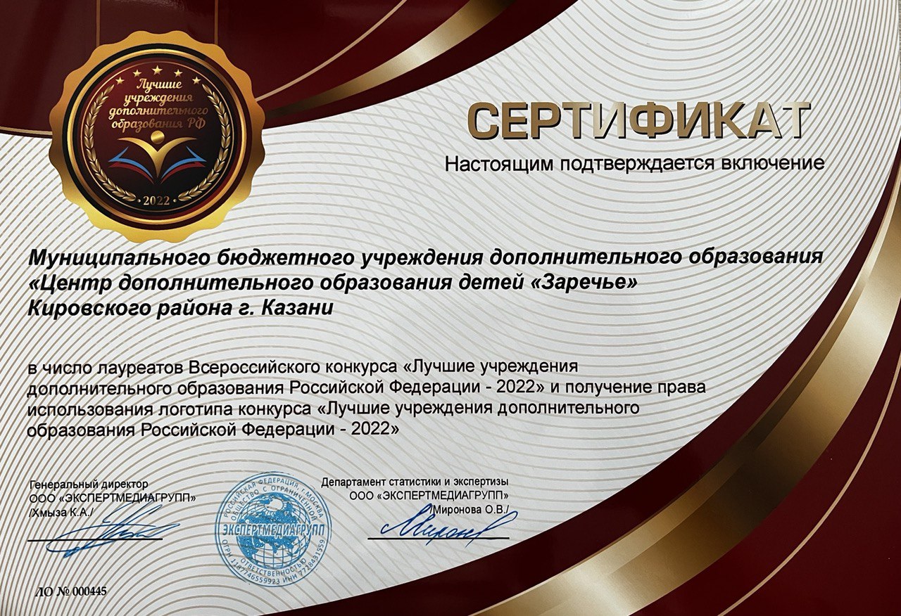 Опубликовано: 31.05.2022Наш Центр стал лауреатом Всероссийского конкурса «Лучшие учреждения дополнительного образования Российской Федерации-2022» и получил право использования логотипа «Лучшие учреждения дополнительного образования Российской Федерации-2022».