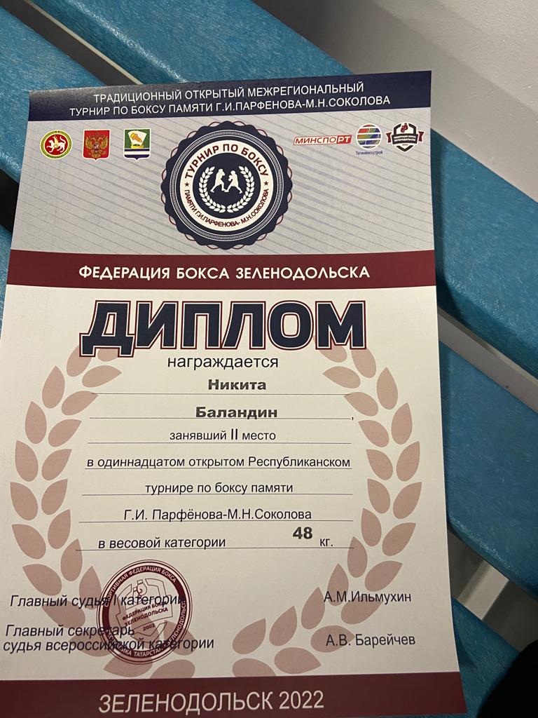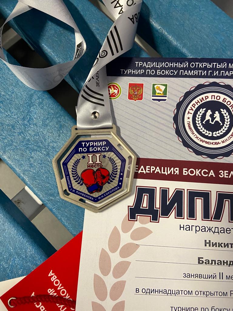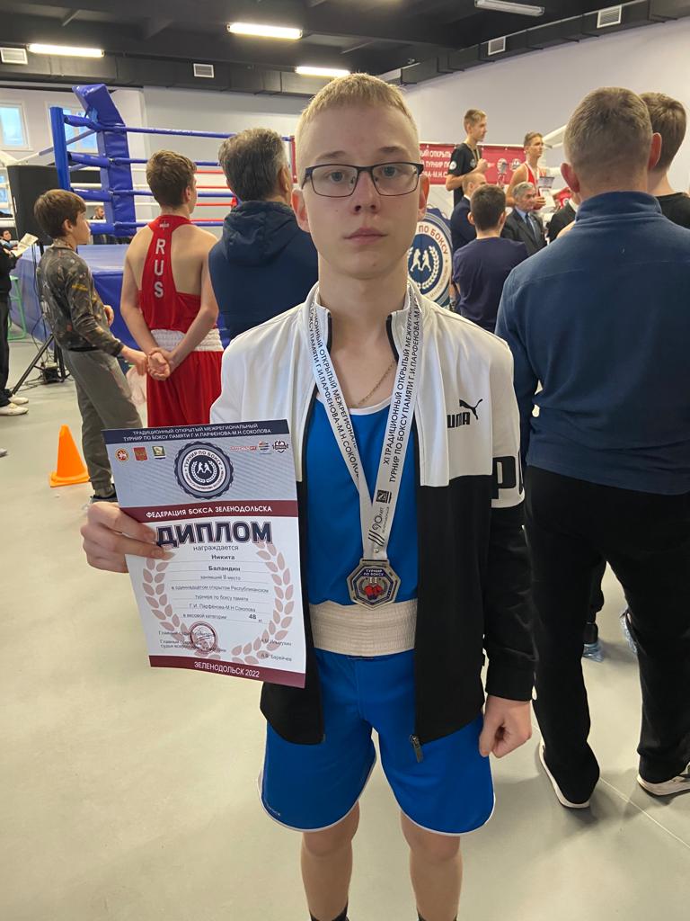 Опубликовано: 07.11.2022В одиннадцатом открытом Республиканском турнире по боксу Баландин Никита (педагог Ахметшин Р.И.) занял 2 место. Поздравляем с победой!