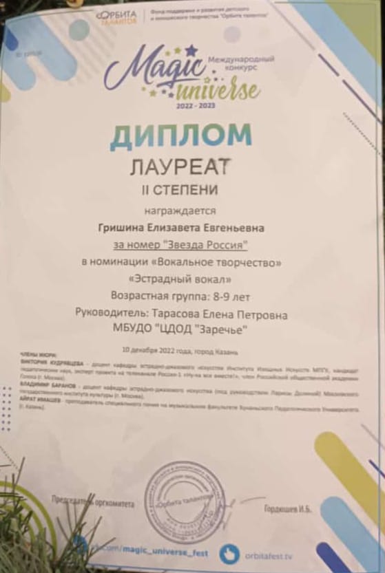 Опубликовано: 12.12.202210 декабря в ДК им. Ленина прошёл Международный конкурс "Magic universe", в котором приняла участие Гришина Елизавета - учащаяся вокальной студии "Исток" (педагог Тарасова Е.П). Поздравляем с первой победой: Елизавета - Лауреат 2 степени.