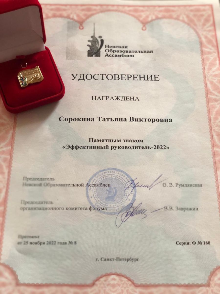 Опубликовано: 10.01.2023Наш Центр принял участие во Всероссийском конкурсе "Образовательная организация XXI века. Лига лидеров - 2022" в рамках Невской образовательной Ассамблеи и стал лауреатом конкурса в номинации "Лучшая организация дополнительного образования детей". Директор Сорокина Татьяна Викторовна была награждена памятным знаком "Эффективный руководитель - 2022".