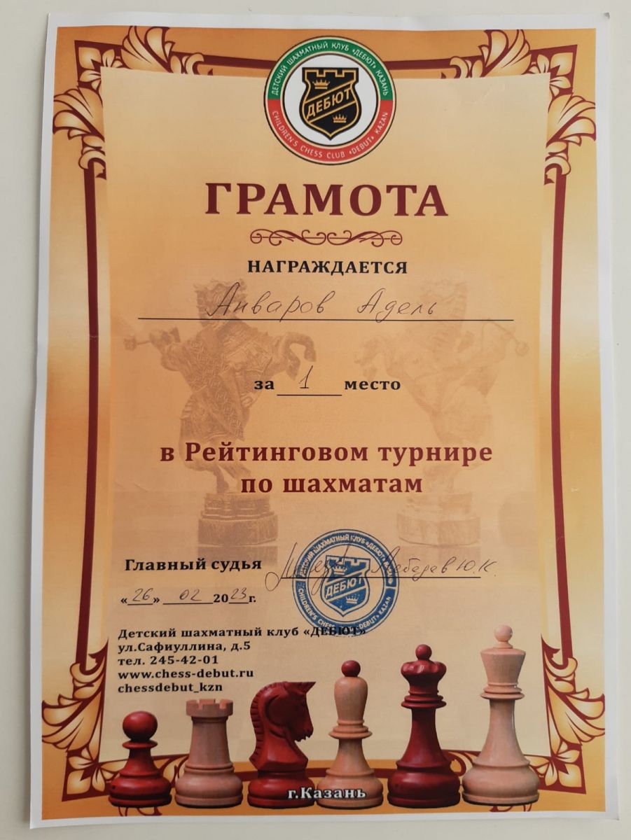 Опубликовано: 13.03.2023Учащийся объединения «Шахматы» (педагог Масалимов Рим Аглямович) Анваров Адель занял I место в Рейтинговом турнире по шахматам, г. Казань.