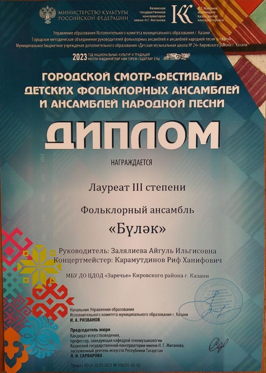Опубликовано: 09.04.20239 апреля 2023 года в Казанской государственной консерватории имени Н.Г. Жиганова прошёл Гала-концерт городского смотра-фестиваля детских фольклорных ансамблей и ансамблей народной песни, на котором обучающиеся объединения «Музыкальный татарский фольклор» фольклорный ансамбль «Бүләк» под руководством педагога Залялеевой Айгуль Ильгизовны и концертмейстера Карамутдинова Рифа Ханифовича стали лауреатами III степени.