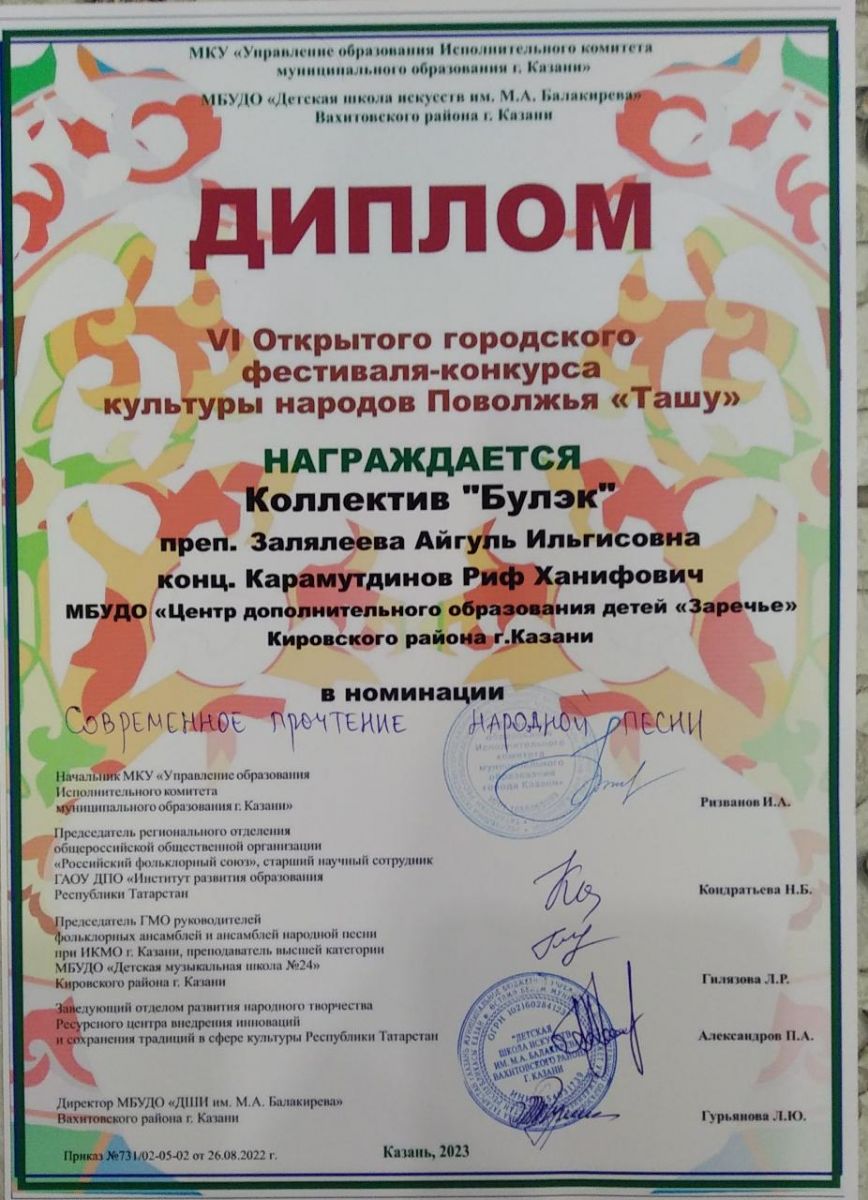 Опубликовано: 25.04.202322 апреля обучающиеся объединения «Музыкальный татарский фольклор» (коллектив «Булэк», педагог Залялеева А.И., концертмейстер Карамутдинов Р.Х.) приняли участие в VI открытом городском детском фестивале культуры народов Поволжья «Ташу» и были награждены дипломом в номинации «Современное прочтение народной песни».
