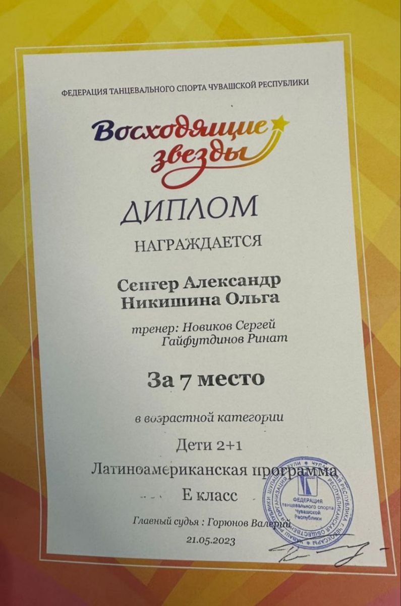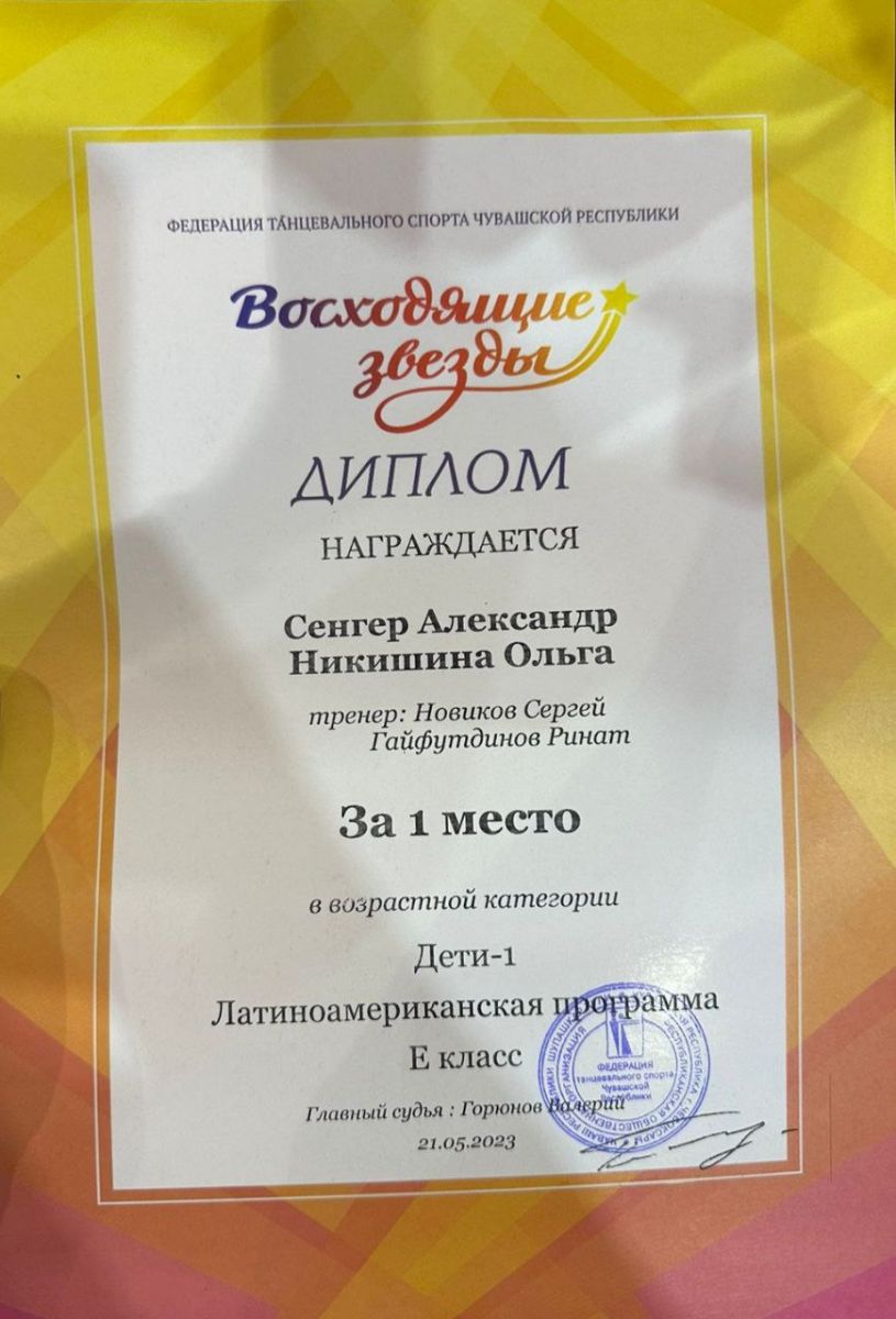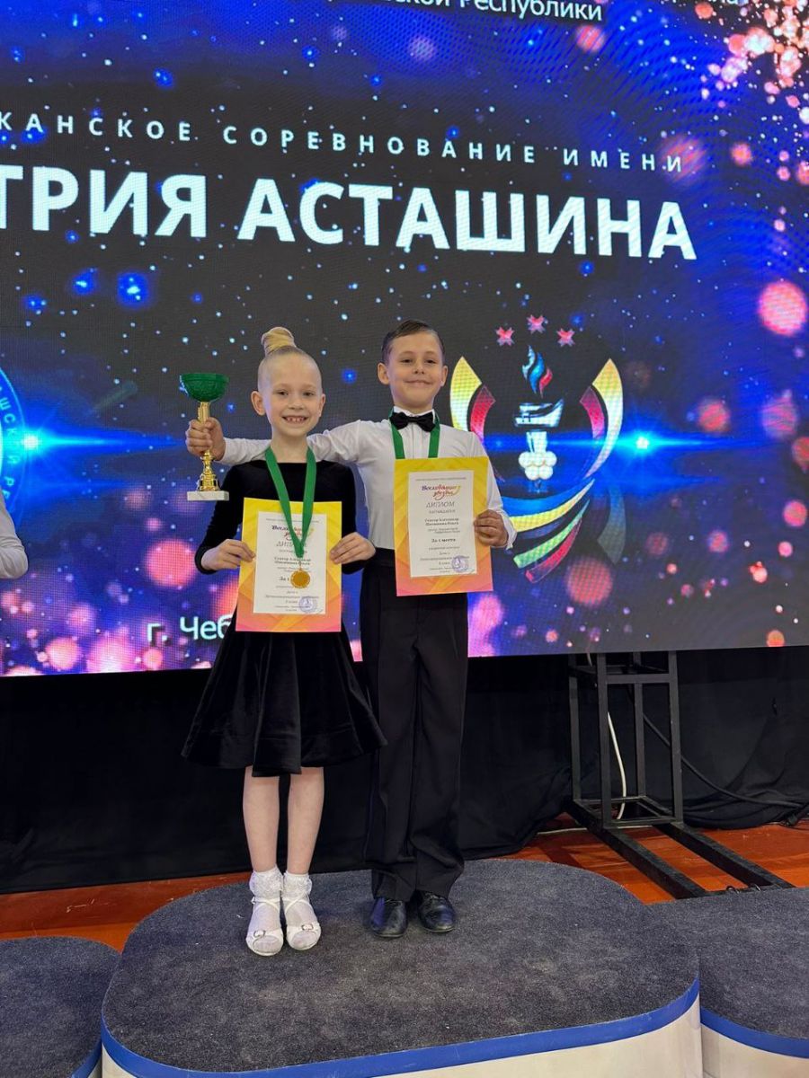 Опубликовано: 22.05.2023Поздравляем объединение "Свей" (педагог Гайфутдинов Р.Н.) - пару Сенгер Александр и Никишина Ольга, занявших 1 место (Латиноамериканская программа Е класс, в возрастной категории Дети - 1) и 7 место (в возрастной категории Дети 2+1), в Республиканских соревнованиях имени Дмитрия Асташина, которые проходили в г. Чебоксары.