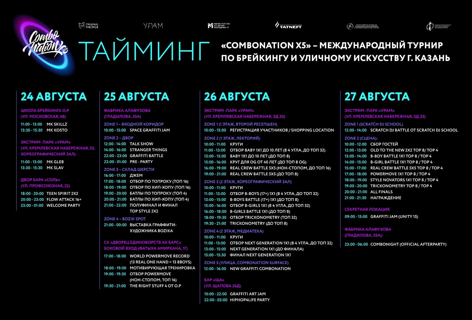 Опубликовано: 23.08.2023С 24 по 27 августа в Казани пройдёт Международный турнир по брейкингу и уличному искусству "Тайминг". Наши юные танцоры объединения "Брейк-данс" (пдо Гоголев Е.В.) примут в нём участие. Пожелаем им успеха.