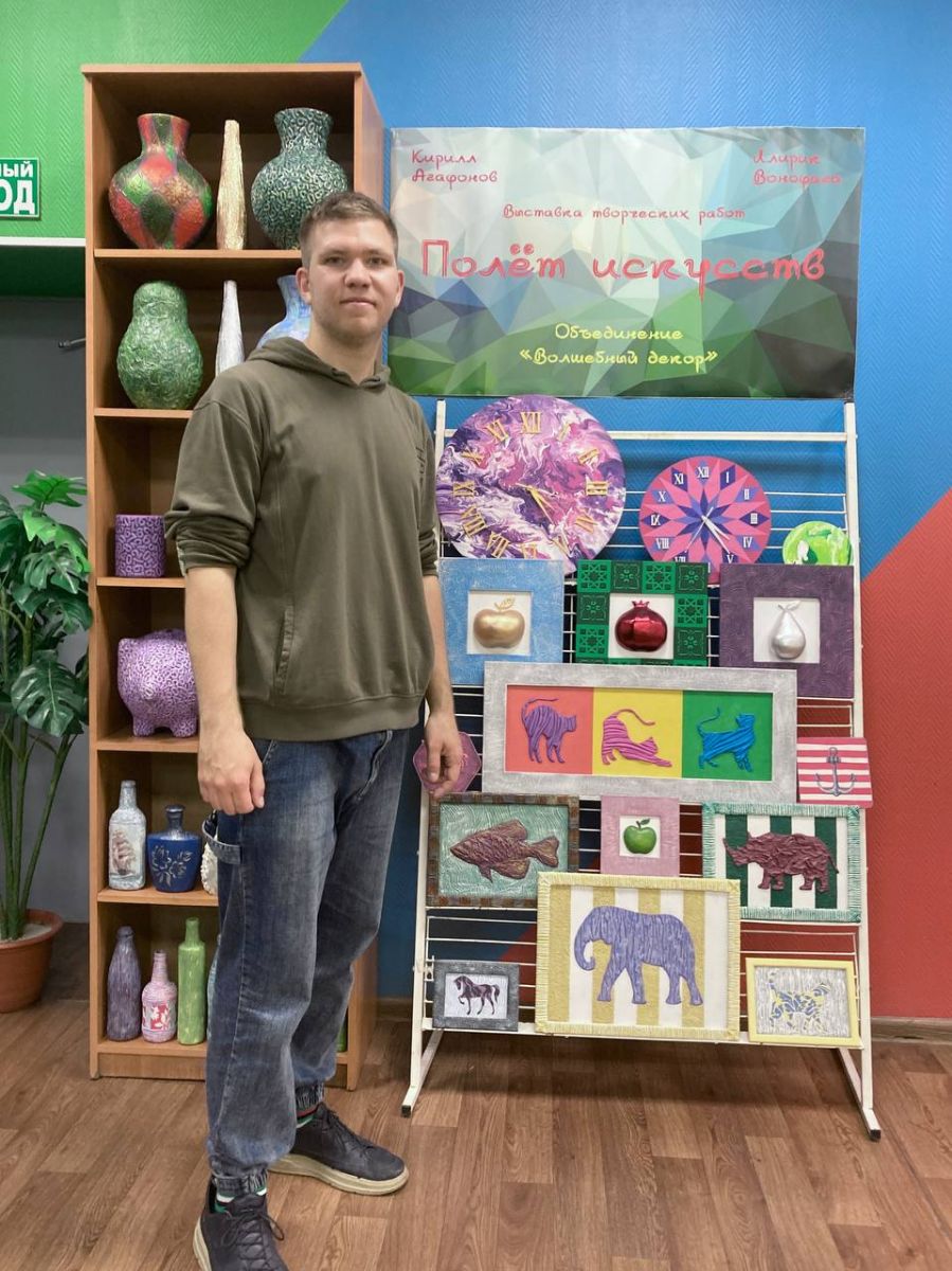 Опубликовано: 04.10.2023В клубе "Полёт" организована выставка творческих работ педагога объединения "Волшебный декор" Агафонова Кирилла Эдуардовича.