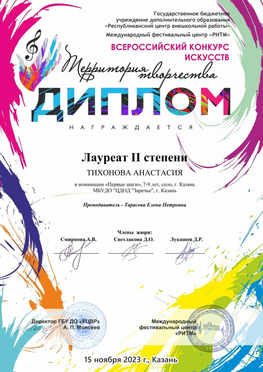 Опубликовано: 21.11.2023Поздравляем солистку вокальной студии "Исток" Тихонову Анастасию с победой во Всероссийском конкурсе искусств "Территория творчества". Желаем дальнейших творческих успехов! Педагог Тарасова Елена Петровна.