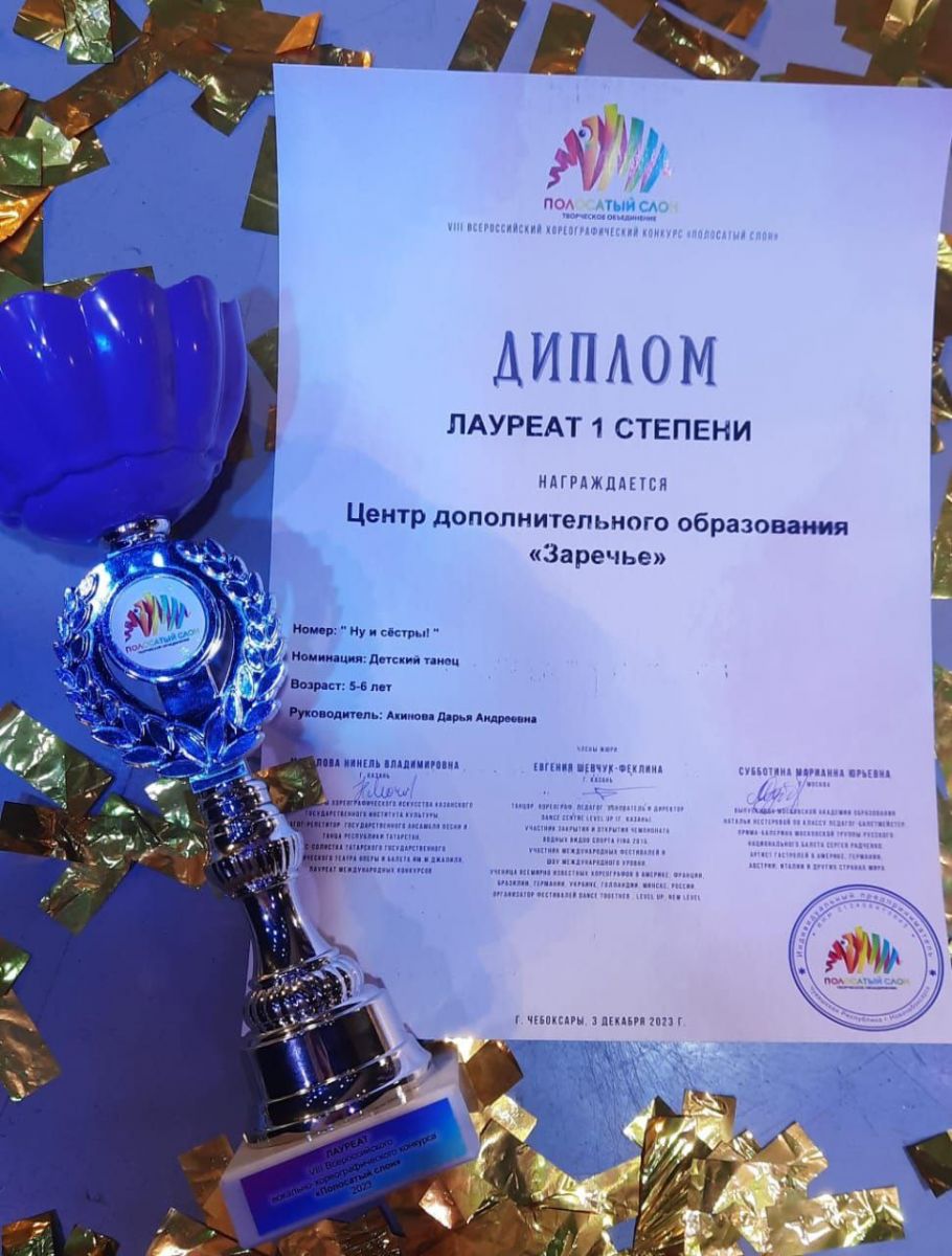 Опубликовано: 03.12.2023Всероссийский конкурс "Полосатый слон" г. Чебоксары. Наши юные танцоры объединения "Лучики Заречья" (пдо Акинова Д.А.) стали лауреатами 1 степени. Молодцы!