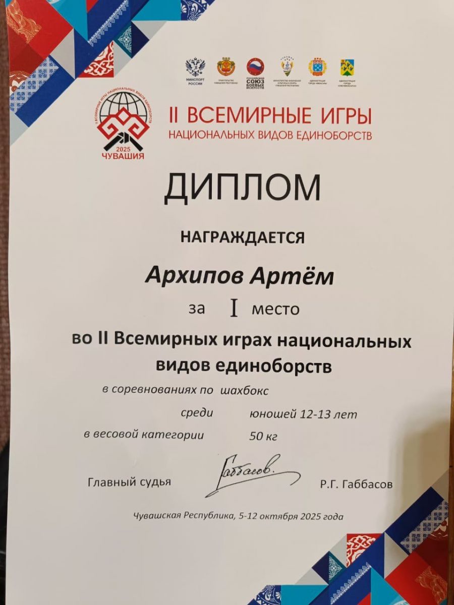 Опубликовано: 13.10.2025С гордостью сообщаем о триумфе нашего учащегося! Архипов Артём завоевал золотую медаль на престижных II Всемирных играх по национальным видам единоборств!