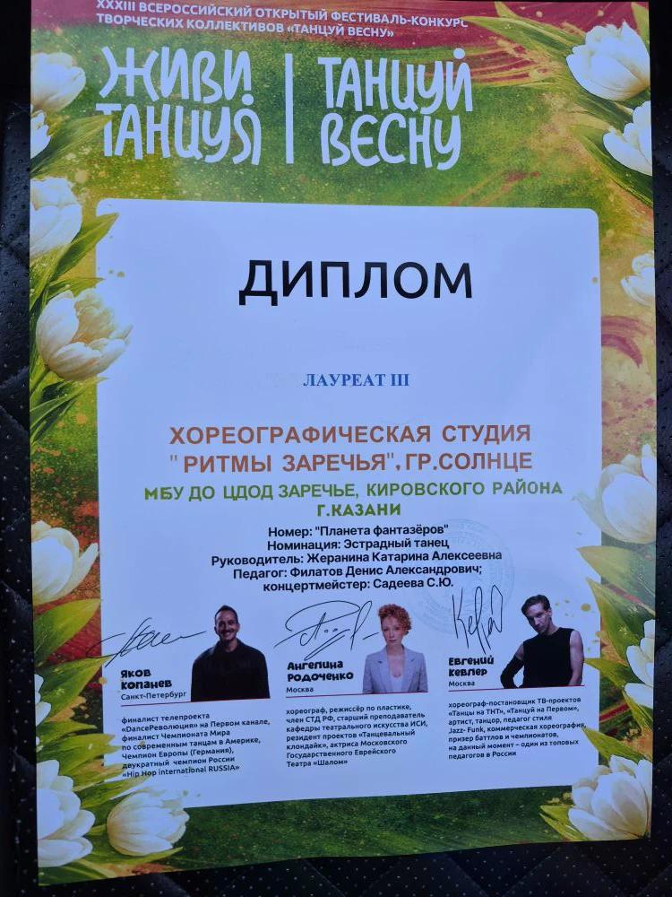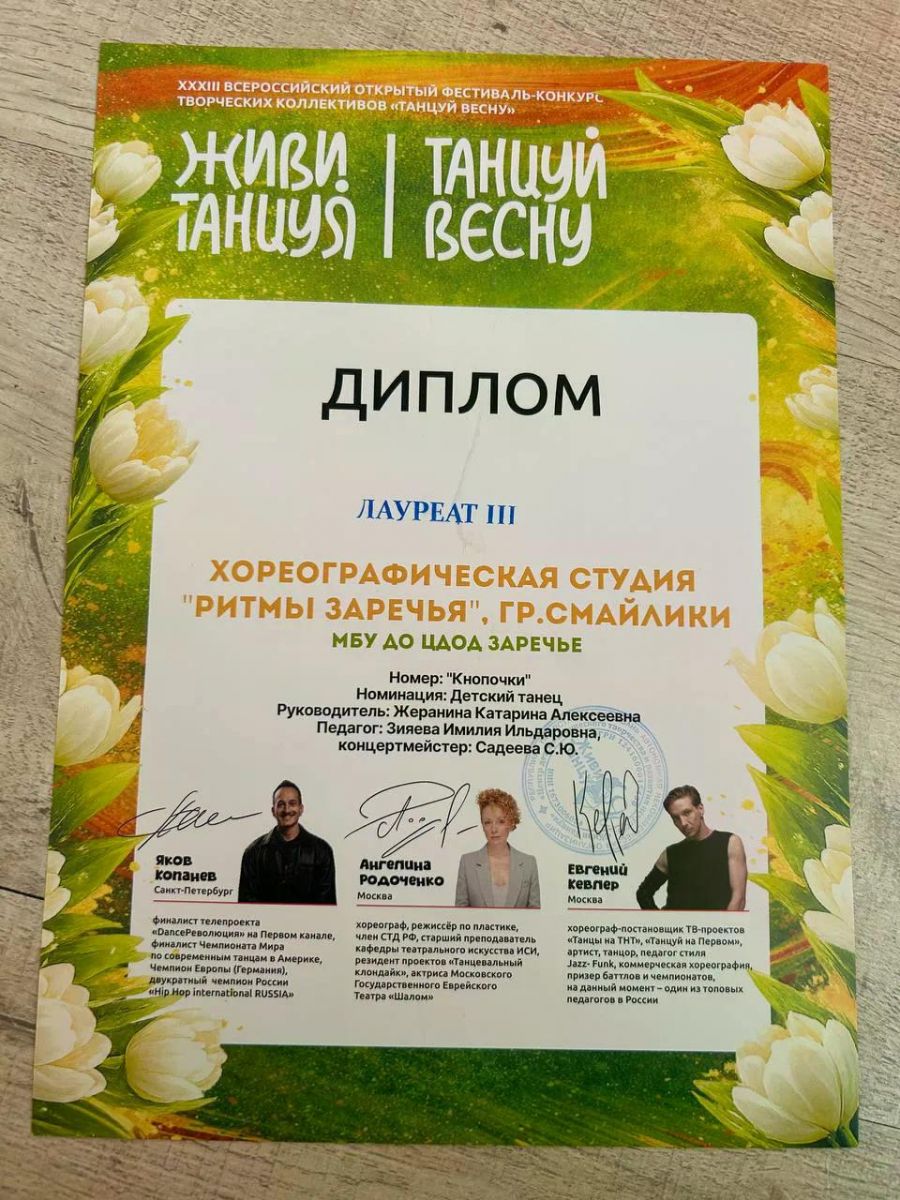 Опубликовано: 15.03.2026Поздравляем группы Солнце, Смайлики и Мечтатели с успешным выступлением на Всероссийском конкурсе «Танцуй весну»! Мечтатели — лауреаты 2 степени, Смайлики — лауреаты 3 степени, Солнце — лауреаты 3 степени. Педагоги Жеранина К.А. и Зияева И.И.