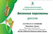 ♦ Хлюзова Диана (саксофон) - Лауреат сразу в нескольких Международных и Всероссийских конкурсах. Преподаватель Саляхова Л.Р.Поздравляем наших юных исполнителей с успехом и желаем дальнейших творческих побед!