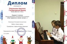 Поздравляем с прекрасным результатом в Международном конкурсе "Снег кружится , летает, летает..." фортепианный дуэт: Окружнова Аделина, Галаветдинов Давид. Ребята стали Лауреатами I степени. Благодарим преподавателя Сафину Альбину Харисовну за подготовку ребят и отличный результат! Желаем дальнейших творческих успехов и новых достижений!