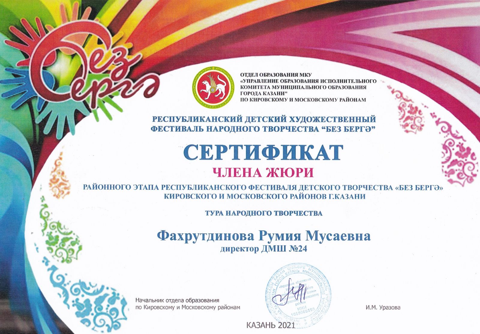 2. Директор МБУДО "ДМШ №24", Фахрутдинова Румия Мусаевна, вошла в состав члена жюри Районного этапа Республиканского фестиваля детского творчества "БЕЗ БЕРГЕ" Кировского и Московского районов