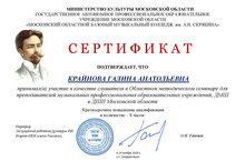 Преподаватель хоровых дисциплин Крайнова Г.А. приняла участие в качестве слушателя семинара. Направление - "Вокальное искусство. Академическое пение".