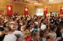 Зал переполнен, на концерт пришли целыми семьями. Ведь хор "Улыбка" - это почти 100 юных хористов первых, вторых и третьих классов. Это три состава исполнителей: хор первоклассников, хор мальчиков и основной состав хора. Дети не только поют в хоре, но и играют на музыкальных инструментах: фортепиано, скрипке, баяне, аккордеоне, гитаре, балалайке, флейте, блокфлейте. Они прекрасно поют сольно, читают стихи, выступают в роли ведущих.