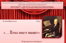 16 декабря 2014 года в рамках общешкольного проекта "Детская филармония" состоится концерт учащихся фортепианного отделения "...Играл сонату пианист". В программе концерта - произведения крупной формы композиторов XVII-XXI веков. Начало концерта в 16 часов 30 минут в малом зале ДМШ № 1.