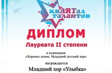 Младший хор "Улыбка" - лауреат 1 степени, Шибаева Варвара - лауреат 2 степени, Хисамова Ивилина - лауреат 3 степени, Крутских Софья - дипломант 1 степени"