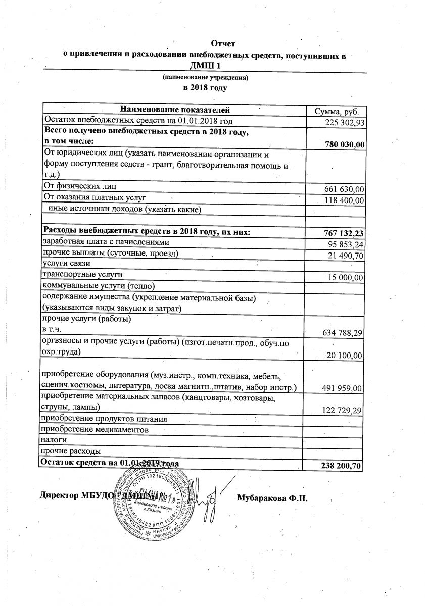 Отчет о привлечении и расходовании внебюджетных средств, поступивших в ДМШ № 1 в 2018 году