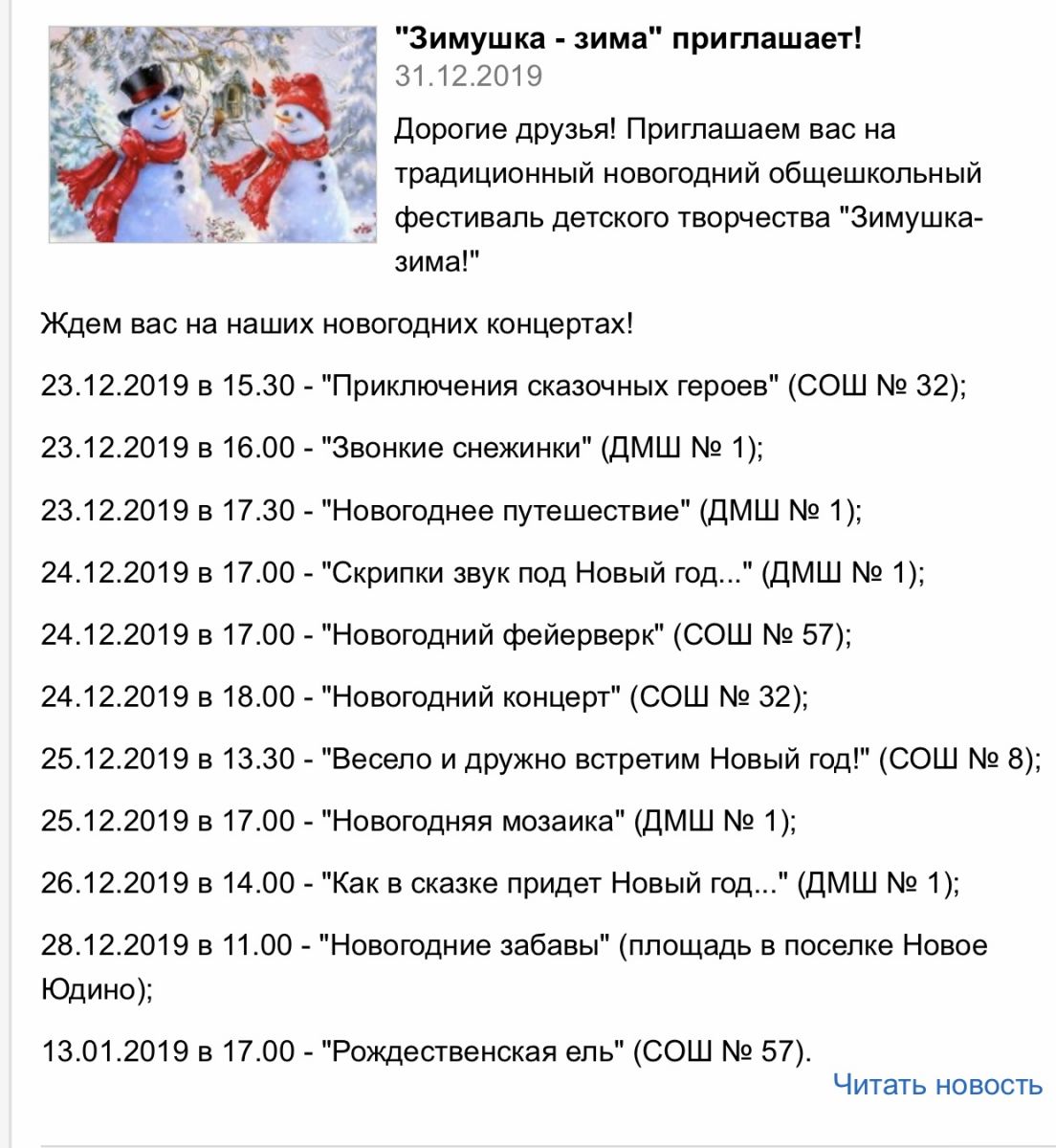 6. Фестиваль детского творчества "Зимушка-зима". В рамках фестиваля проведено 11 концертов в СОШ № 8, 32, 57, 151 с 23 декабря 2019 по 13.01.2020