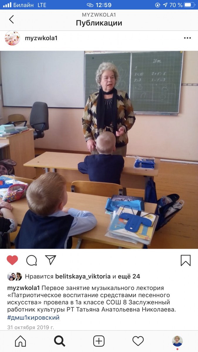 12. Музыкальный лекторий для учащихся 1 класса СОШ № 8 "Патриотическое воспитание средствами песенного искусства". Автор и ведущая - Заслуженный работник культуры РТ Татьяна Анатольевна Николаева. Состоялись занятия - "С песней по жизни" 31.10.2019, "Русская народная песня" 29.11.2019, "Елочка, гори" 21.12.2019, "Татарская народная песня" 30.01.2020, "Песни славян" 06.03.2020.