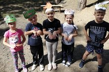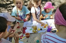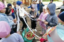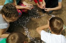 Дети всех возрастных групп с удовольствием играют с природным материалом, который в достаточном количестве присутствует на территории нашего детского сада. Дети младшего возраста собирают муравейники из сосновой хвои и узнают от воспитателей много нового о жизни и деятельности этих насекомых. Дети постарше красят шишки в разные цвета, выкладывают из них все, что захотят. Особенно старшим дошкольникам пришелся по вкусу татарский национальный орнамент.